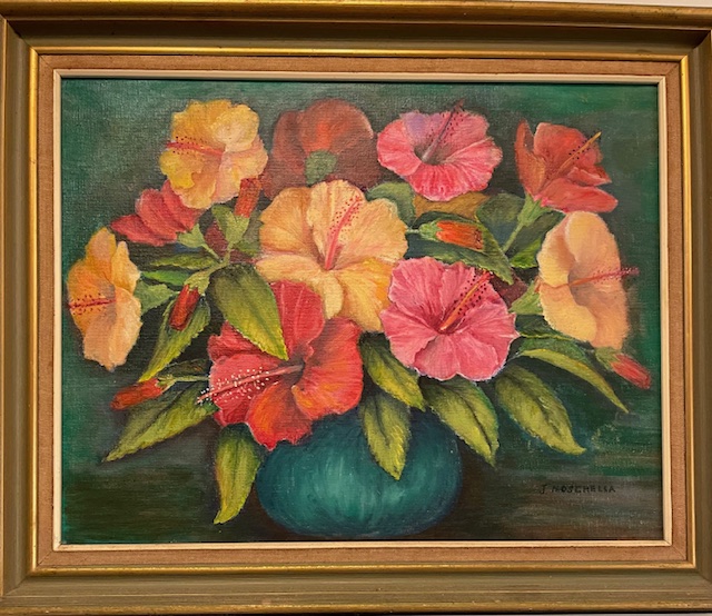 This vibrant still life painting captures a lush bouquet of hibiscus flowers in full bloom, arranged in a deep teal ceramic vase. The composition showcases an array of richly colored petals—from fiery reds and bright oranges to soft pinks and warm yellows—set against a dark green background that enhances the vividness of the blossoms. Lush green leaves and delicate stamens bring texture and depth to the piece. Signed by the artist,  this artwork radiates tropical warmth and timeless beauty, making it a perfect addition to any art lover’s collection or tropical-themed décor.