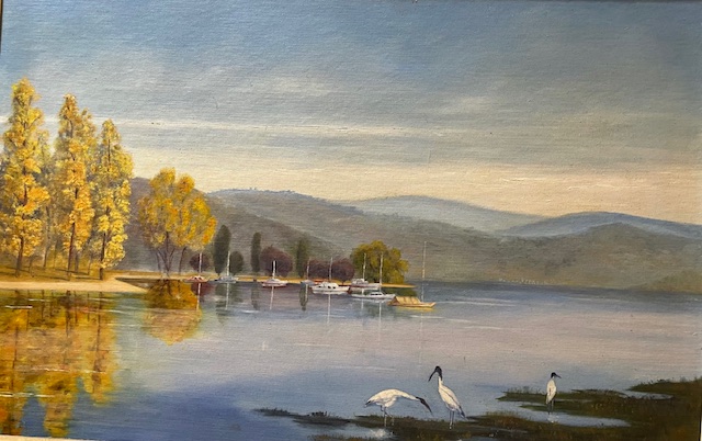This captivating painting captures the tranquil beauty of Lake Burley Griffin in Canberra, bathed in the golden light of the day. Delicate reflections ripple across the still water, mirroring the tall autumn-toned trees that line the shore. In the distance, boats rest peacefully at a small marina, nestled beneath softly rolling hills. Three elegant birds wade gracefully in the shallow waters in the foreground, adding a touch of life and movement to the serene scene. The scene beautifully balances natural calm with gentle color transitions, evoking a sense of peace and quiet contemplation.