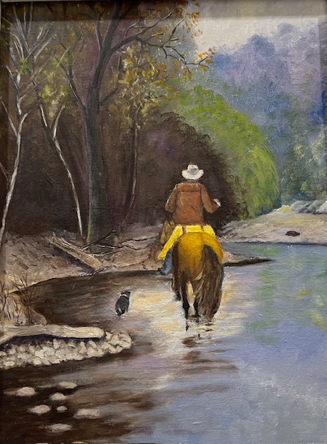 This evocative painting captures a tranquil moment in nature as a lone rider, clad in a brown coat and white hat, gently guides a golden horse through the calm waters of a shallow stream. The scene is framed by a forest of tall, leafless trees on one side and lush green foliage on the other, suggesting the quiet transition between seasons. A loyal black dog walks beside them, reflecting the deep companionship between human and animal. With soft brushstrokes and a rich, earthy color palette, the artwork invites the viewer into a peaceful, introspective journey through the wilderness.